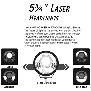 The latest in advanced engineering for the off-road lighting industry are the Hybrid LASER + LED Driving Light technology. Laser technology make a massive improvement to the amount of distance you can get out of your spot-beam light, (up to 2000mtrs, depending on which lights you get), and the led's around the lights give you a spread of light across each side of the road. The laser lights are available in 5 3/4 and 7 inch headlights, a 7 inch and 9 inch driving light/spot light, and single or dual row light bars. Each light comes with everything you need for easy fitting and the introductory price includes delivery costs world-wide. The latest in driving enthusiast auxiliary lighting has just arrived! Enjoy!